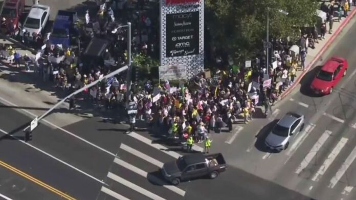 As of 2:30 p.m., Sky5 was overhead of downtown Los Angeles, where thousands of demonstrators were seen filling Alameda Street between Aliso and Temple streets, and marching westbound on 1st Street from Spring Street towards Grand Avenue.